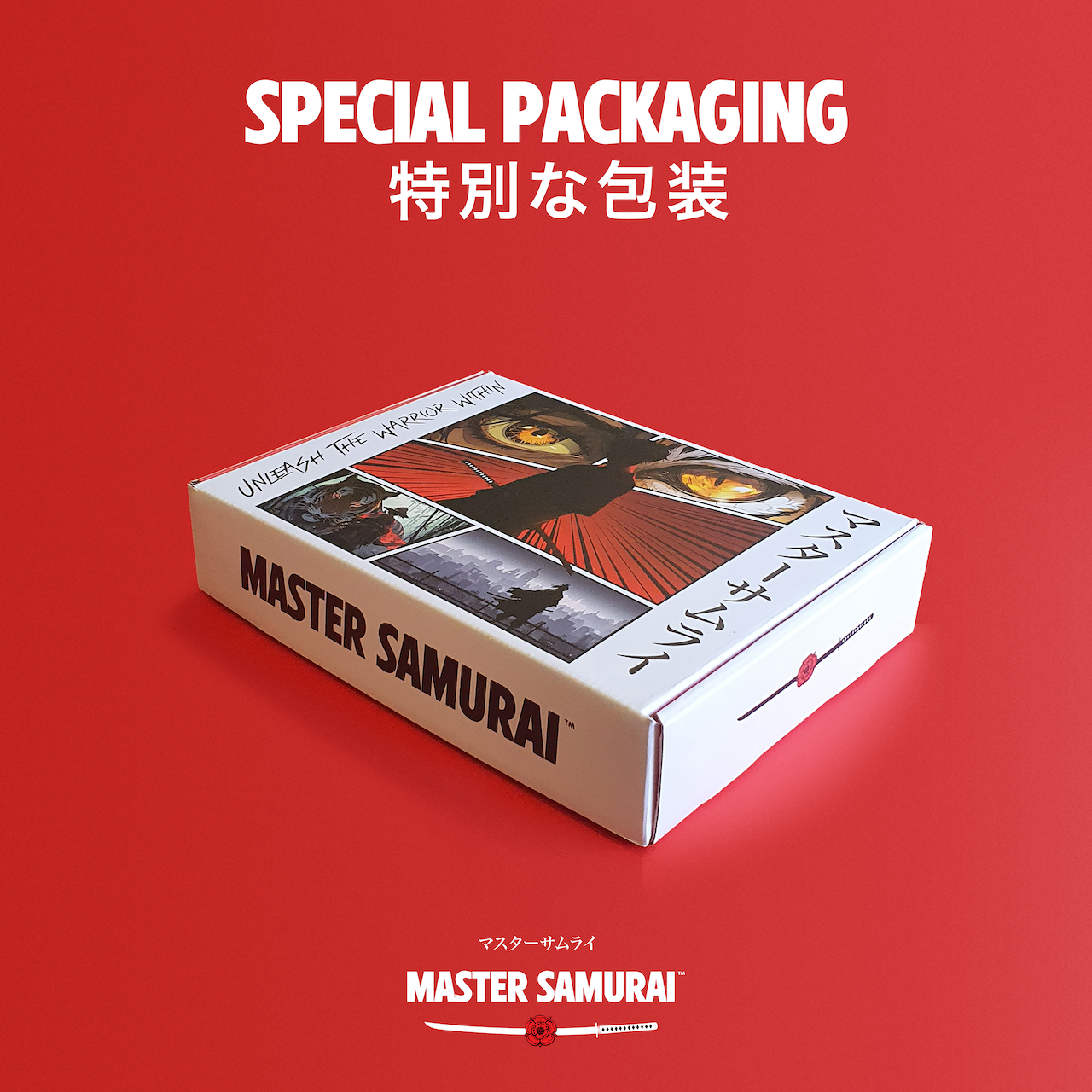 Every piece of Master Samurai Clothing comes in a collector's edition mailer box. Unbox the experience with an origin story printed in a captivating comic strip layout on top. It's not just a tee; it's a journey.